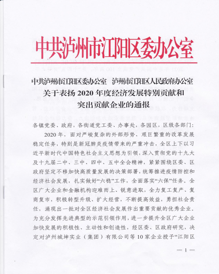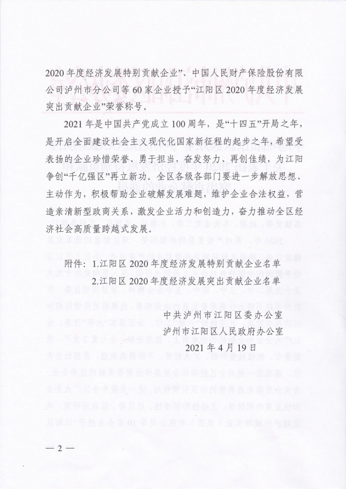2021年4月20日上午,中共瀘州市江陽區(qū)委、瀘州市江陽區(qū)人民政府在江陽會議中心召開2021年區(qū)委經(jīng)濟工作會議,會議隆重表彰了在2020年為江陽區(qū)經(jīng)濟發(fā)展作出特別貢獻的優(yōu)秀企業(yè)10家,作出突出貢獻的優(yōu)秀企業(yè)60家,其中四川興順勞務代理有限公司再一次榜上有名,榮獲“瀘州市江陽區(qū)2020年度經(jīng)濟發(fā)展突出貢獻獎”榮譽稱號。